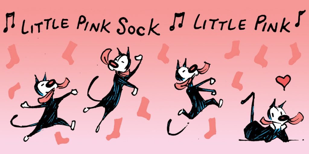 His passion begets a simple love song (“Little pink sock, little pink sock”), the melody of which is left to the reader’s imagination.