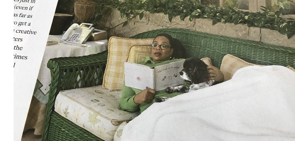 Page 17 of the magazine includes a letter introducing Oprah Winfrey’s annual summer reading guide. It also features a photo of Oprah herself, curled up on a couch with one of her beloved pups and a copy of Patrick’s bestselling picture book The Gift of Nothing!